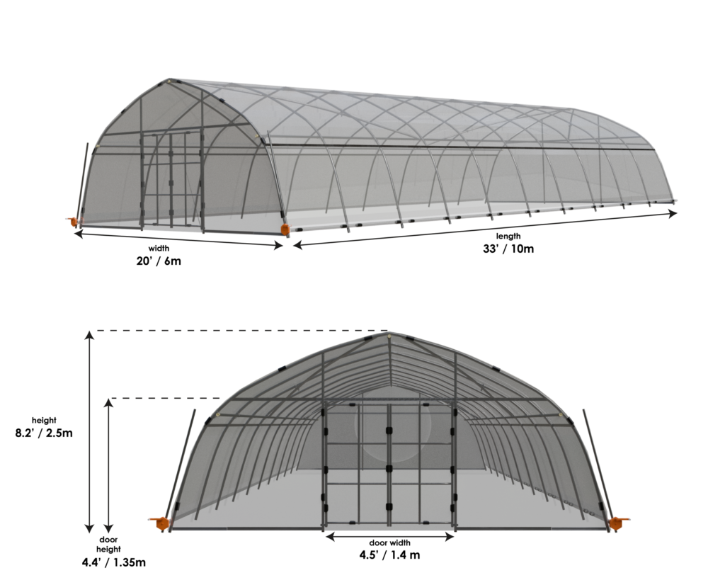 Our assembled high tunnels are equipped with a tarp roller that allows you to control the ventilation and temperature at anytime. By allowing fresh air to flow through, this high tunnel prevents excessive heat buildup and help create an ideal microclimate for your plants. Additionally, our high tunnel is equipped with two doors. It makes transporting growing medium and plants a breeze.